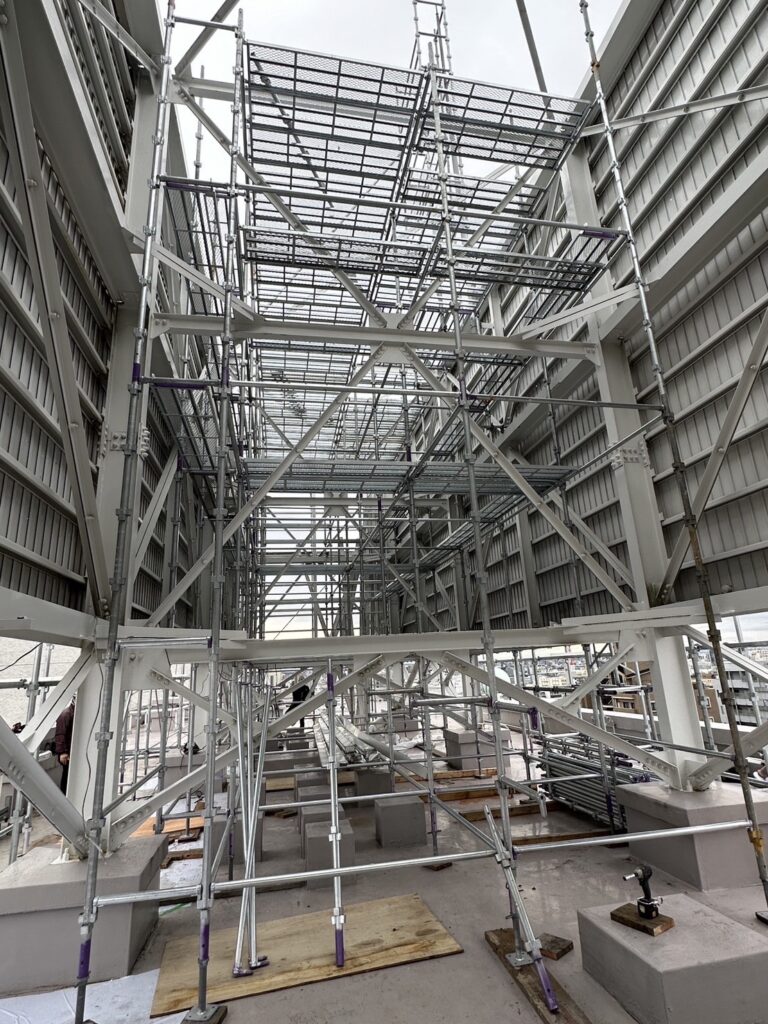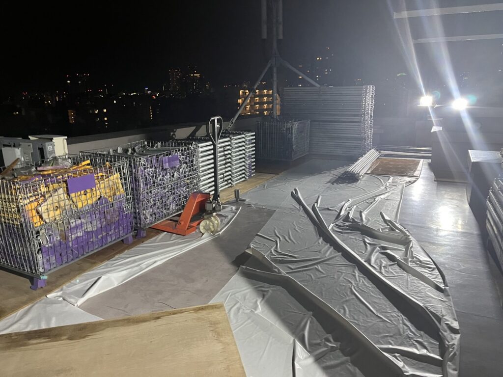 クレーンを使用して、足場の部材を屋上へ運び込みます。