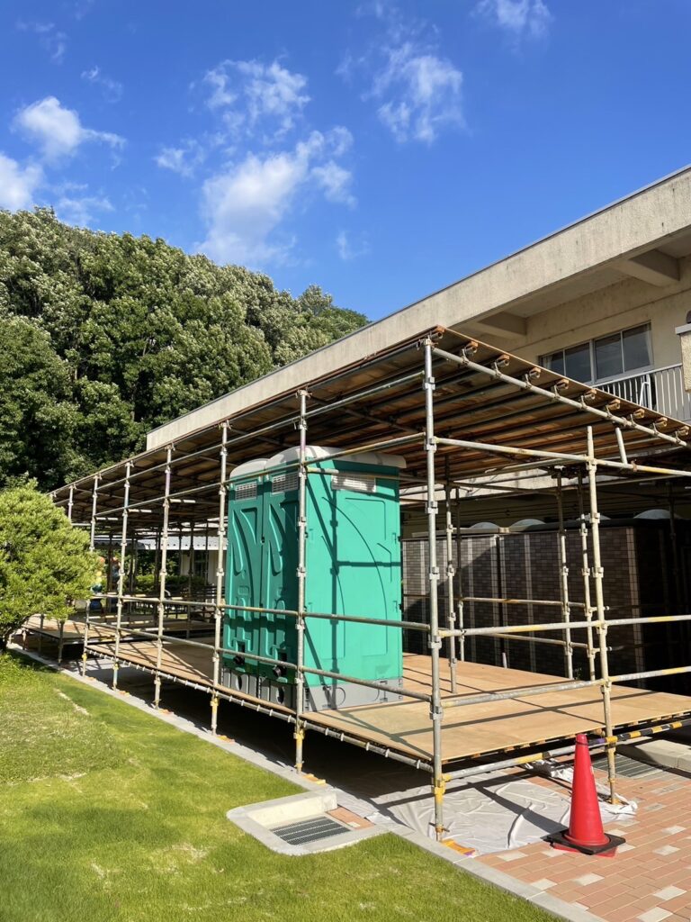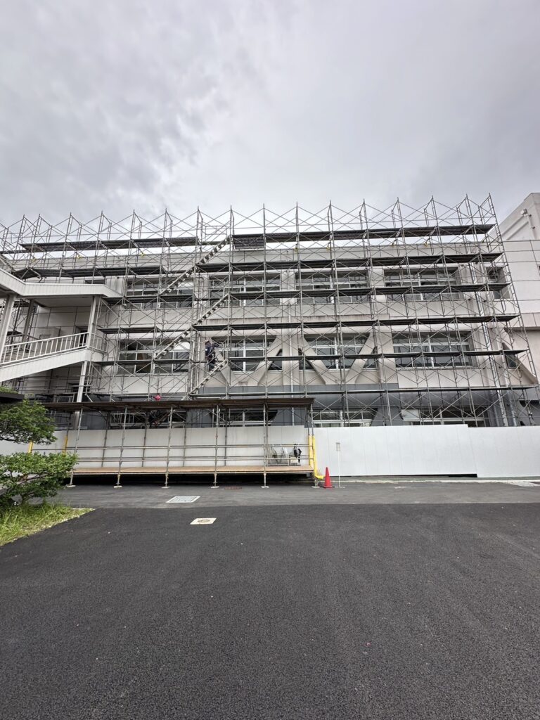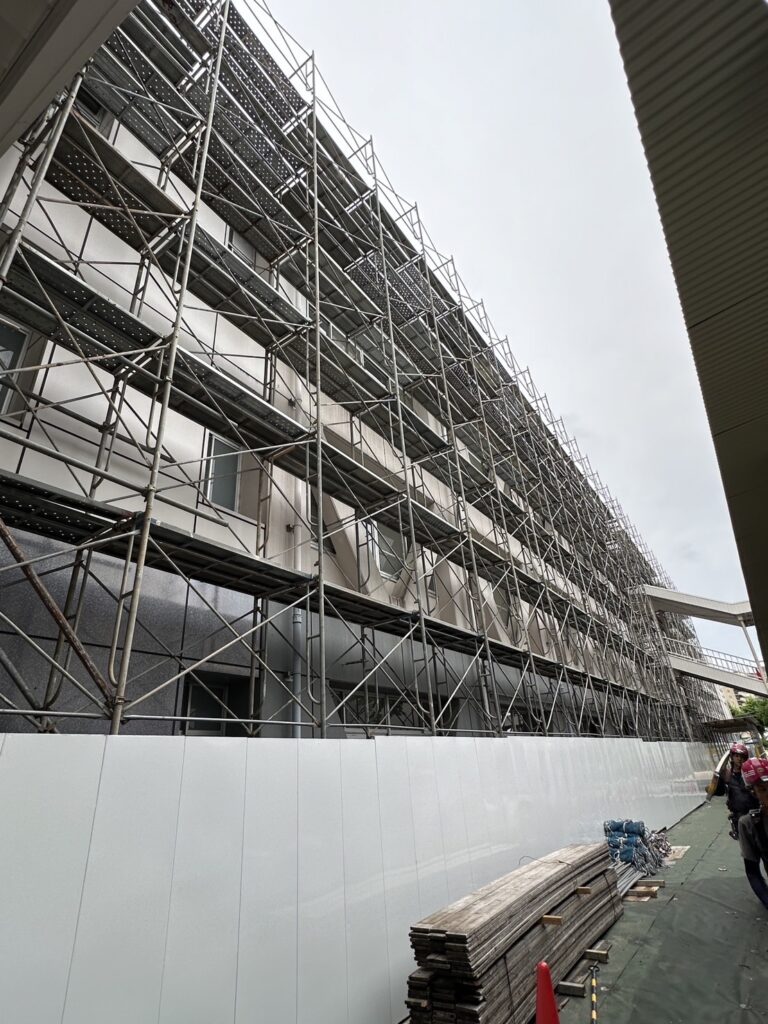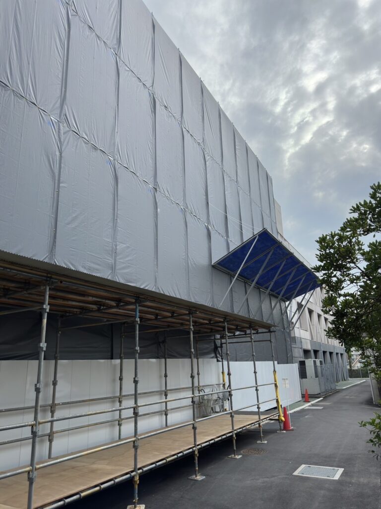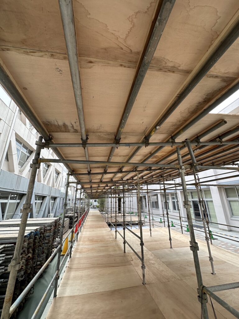 今回は、通常の足場施工と並行して行った屋根付き仮設通路について、ご紹介いたします。 このようなものも仮設できますので、工事でお求めでしたらぜひ参考にしてみてください!